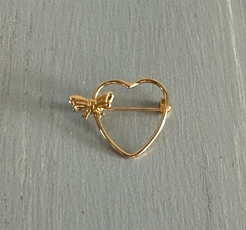 Beautiful Shiny Gold Tone Heart w Bow Vintage Brooch