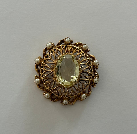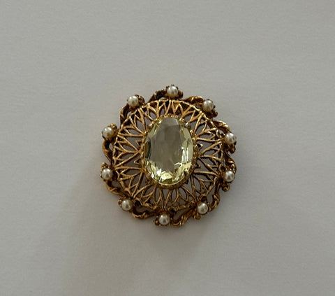 Florenza Glorious Vintage Pendant w Tiny Pearls & a Large Yellow Rhinestone