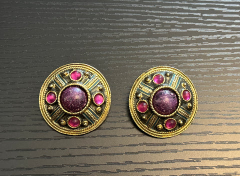 Retro Cool Vintage Clip On Earrings Gold Tone Metal Pink & Purple Cabochons
