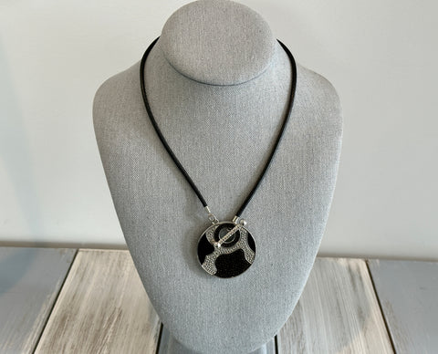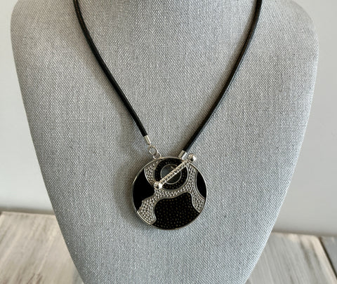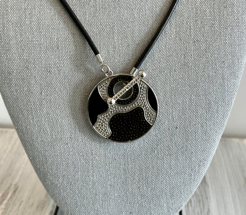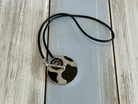 SILVER TONE, BLACK ENAMEL & A COPPER /BRONZE SPARKLE ENAMEL (?) PENDANT